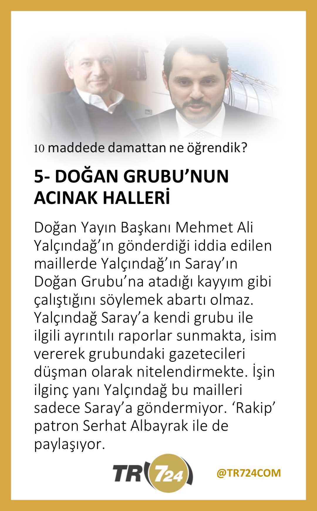 Doğan grubu ile ilgili bir diğer skandal ise bir istifa ile sonuçlandı. Doğan Yayın Başkanı Mehmet Ali Yalçındağ’ın gönderdiği iddia edilen maillerde Yalçındağ’ın Saray’ın Doğan Grubu’na atadığı kayyım gibi çalıştığını söylemek abartı olmaz. Yalçındağ Saray’a kendi grubu ile ilgili ayrıntılı raporlar sunmakta, isim vererek grubundaki gazetecileri düşman olarak nitelendirmekte. İşin ilginç yanı Yalçındağ bu mailleri sadece Saray’a göndermiyor. ‘Rakip’ patron Serhat Albayrak ile de paylaşıyor. Ortaya çıkan maillerden sonra Yalçındağ görevinden ayrılmak zorunda kaldı.