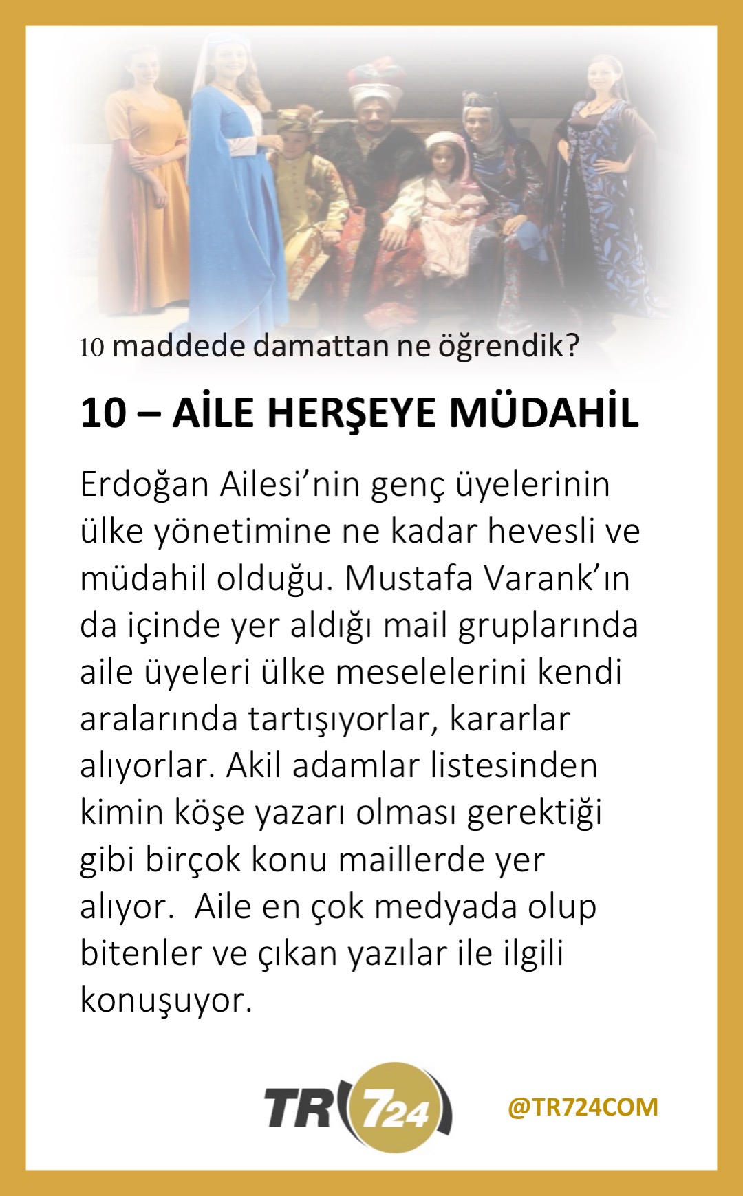 Maillerde hemen dikkati çeken bir durum da Erdoğan Ailesi’nin genç üyelerinin ülke yönetimine ne kadar hevesli ve müdahil olduğu. Mustafa Varank’ın da içinde yer aldığı mail gruplarında aile üyeleri ülke meselelerini kendi aralarında tartışıyorlar, kararlar alıyorlar. Akil adamlar listesinden kimin köşe yazarı olması gerektiği gibi birçok konu maillerde yer alıyor. Aile en çok medyada olup bitenler ve çıkan yazılar ile ilgili konuşuyor.