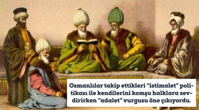 Osmanlılar takip ettikleri “istimalet” politikası ile kendilerini komşu halklara sevdirirken “adalet” vurgusu öne çıkıyordu. Bugün mahkeme salonlarında gördüğümüz “Adalet mülkün temelidir” sözünün en iyi örneği olan Bursa Ulu Caminin inşası esnasında bir gayrimüslim kadının arsasını satmaması olayı ve Fatih Sultan Mehmet’in cami inşaatından dolayı bir Rum mimarla Üsküdar kadısı tarafından yargılanması gibi hadiseler adalet örneği olarak yüzyıllar boyunca anlatıldı.