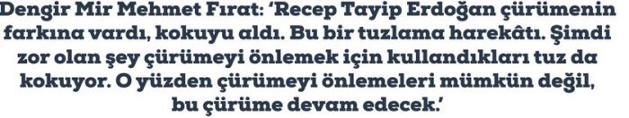‘Bu bir metal yorgunluk değil, bir çürüme. Şimdi çürümeyi önlemeye çalışıyorlar. Genel Başkan Recep Tayip Erdoğan çürümenin farkına vardı, kokuyu aldı. Bu bir tuzlama harekâtı. Şimdi zor olan şey çürümeyi önlemek için kullandıkları tuz da kokuyor. O yüzden çürümeyi önlemeleri mümkün değil, bu çürüme devam edecek.’