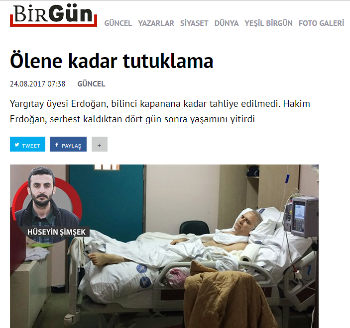 Birgün Gazetesi’nden Hüseyin Şimşek, Yargıtay üyesi Erdoğan’a yapılan zulmü, Anayasa Mahkemesi ve mahkemlerin yanlış kararlarını kaleme aldı. Ölene kadar tutuklama başlıklı yazıda geçtiğimiz günlerde vefat edene kadar tahliyesi yapılmayan Erdoğan’ın dramatik ve ölümü yargının hukuksuz kararları irdelendi. Birgün’deki yazı şöyle: