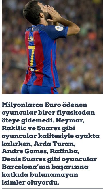 2008’den itibaren takımın iskeletini oluşturan oyuncular bir bir koparken, sıkıntı La Masia’nın yeni oyuncular yetiştirmiyor olmasıydı. Doğal olarak Barcelona dış transfere yöneldi. Önünde iki yol vardı: ya yıllarca oynadığı sistemden taviz verecek ya da gelen oyuncuların bu sisteme adapte olmasını bekleyecekti. Gelgelelim milyonlarca Euro ödenen oyuncular birer fiyaskodan öteye gidemedi. Neymar, Rakitic ve Suarez gibi oyuncular kalitesiyle ayakta kalırken, Arda Turan, Andre Gomes, Rafinha, Denis Suarez gibi oyuncular Barcelona’nın başarısına katkıda bulunamayan isimler oluyordu.