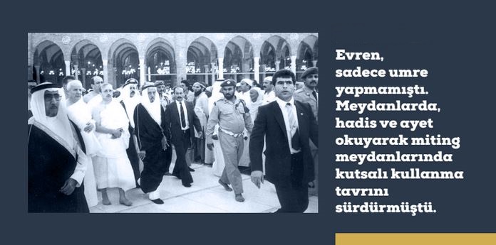 Ancak Erdoğan’ın kutsal değerleri siyasetine alet etmesi hususu bugüne kadar gelmiş geçmiş politikacıları emsal tutmayacak kadar çok. Üstelik suistimalleri de apaçık görülecek cinsten. Önceki günkü Umre manzaralarına bakıp Twitter’da Kenan Evren’in 1981 Anayasa referandumu öncesi fotoğrafını yanına koyarak hatırlatma yapanlar oldu. Evren, sadece umre yapmamıştı. Meydanlarda, hadis ve ayet okuyarak miting meydanlarında kutsalı kullanma tavrını sürdürmüştü.