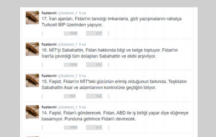Sosyal medya fenomeni Fuat Avni’nin, “MİT’çi Sabahattin, Fidan hakkında bilgi ve belge topluyor. Fidan’ın İran’la çevirdiği tüm dolapları Sabahattin ve ekibi arşivliyor. Faşist, (Erdoğan’ı kastediyor) Fidan’ın MİT’teki gücünün erimiş olduğunun farkında. Teşkilatın Sabahattin Asal ve adamlarının kontrolüne geçtiğini biliyor.” yazdığı kişi.