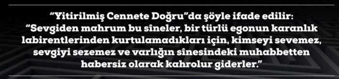 “Yitirilmiş Cennete Doğru”da şöyle ifade edilir: “Sevgiden mahrum bu sîneler, bir türlü egonun karanlık labirentlerinden kurtulamadıkları için, kimseyi sevemez, sevgiyi sezemez ve varlığın sînesindeki muhabbetten habersiz olarak kahrolur giderler.”