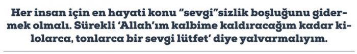 Her insan için en hayati konu “sevgi”sizlik boşluğunu gidermek olmalı. Sürekli ‘Allah’ım kalbime kaldıracağım kadar kilolarca, tonlarca bir sevgi lütfet’ diye yalvarmalıyım. Ümitsizliğe yer yok. “Allah ölüden diriyi, diriden ölüyü çıkarır.”(3/27)