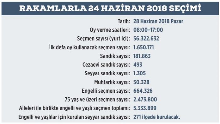 Türkiye’de 56 milyon 322 bin seçmen 24 Haziran Pazar günü sandık başına gidiyor. İki pusula, iki oy ve tek zarfla yeni cumhurbaşkanlığı hükûmet sistemi ilk kez tecrübe edilecek.