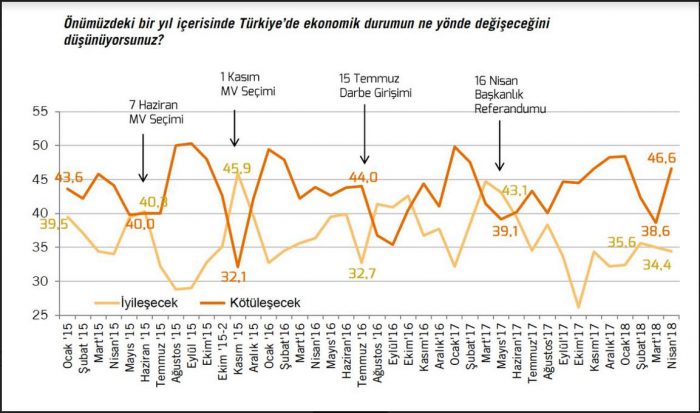 Metropoll Araştırma Şirketi’nin hazırladığı grafik Türkiye’de ekonomi bozulduğunda seçmenin iktidarı nasıl cezalandırdığını gösteriyor. Grafikten çıkarılacak mesaj şu: Ekonomik veriler ne kadar kötüleşmişse iktidara verilen destek de o kadar aşağı iniyor.