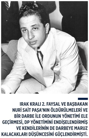 DP’yi otoriterleşmeye ve cephe siyasetine iten dış faktörler de olmuştur. Bunların başında Irak’ta yaşanan darbe gelmektedir. Irak Kralı 2. Faysal ve Başbakan Nuri Sait Paşa’nın öldürülmeleri ve bir darbe ile ordunun yönetimi ele geçirmesi, DP yönetimini endişelendirmiş ve kendilerinin de darbeye maruz kalacakları düşüncesini güçlendirmişti.