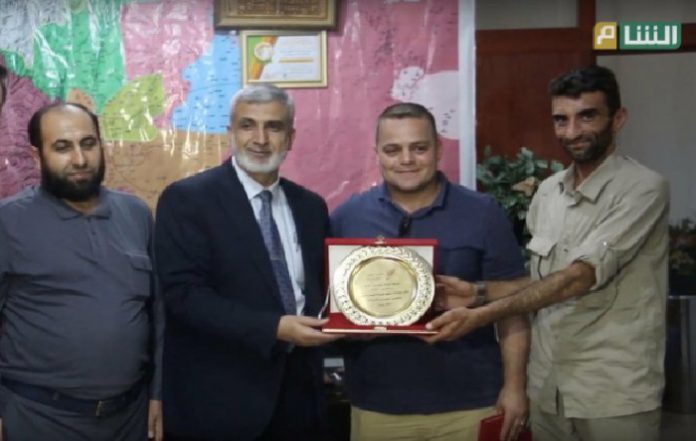Şamuna Haber Ajansı’nın yayınladığı ödül töreninde Kurtuluş Hükümeti yetkilileri “Devrime hizmet eden ve İdlib’te yaşanan dramı dünyaya aktaran” yerel ve uluslararası medya kuruluşlarının temsilcileriyle bir araya geldi. Törende Kurtuluş Hükümeti Başbakanı Fevvaz Helal, TRT’nin Suriye’de tartışmalı haberlere imza atan muhabiri Ubeyde Hitto’ya ödülünü takdim etti.