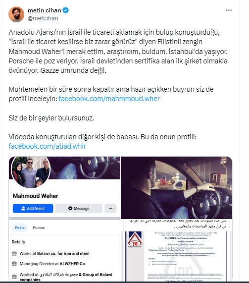 Bu kez İsrail’e yapılan ihracatın aslında Filistin’e gönderildiği bizzat iktidar medyası tarafından ortaya konulma çabasına girildi. Anadolu Ajansı’nın “İsrail ile ticaret kesilirse Filistinliler zarar görür” diye konuşturduğu Mahmoud Waher’in peşine düşen Metin Cihan, merhamet bu isteyen kişinin Porsche tutkunu, İsrail işbirlikçisi bir züppe işadamı olduğunu ortaya çıkardı.