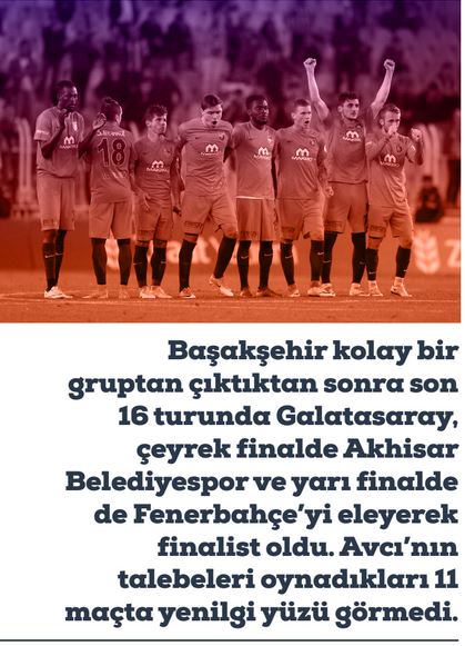 Başakşehir kolay bir gruptan çıktıktan sonra son 16 turunda Galatasaray, çeyrek finalde Akhisar Belediyespor ve yarı finalde de Fenerbahçe’yi eleyerek finalist oldu. Abdullah Avcı’nın talebeleri, oynadıkları 11 maçın altısını kazanıp beşinde berabere kaldı ve hiç yenilmedi. Rakip ağlara 20 gol atan Medipol Başakşehir, kalesinde ise 8 gol gördü. 2010-11 sezonunda da Türkiye Kupası finali oynayan takım, Beşiktaş’la karşılaşmıştı. Normal süresi 2-2 biten maçta kupayı penaltı atışları belirlemiş ve Beşiktaş 6-5 üstünlük kurarak kupanın sahibi olmuştu.
