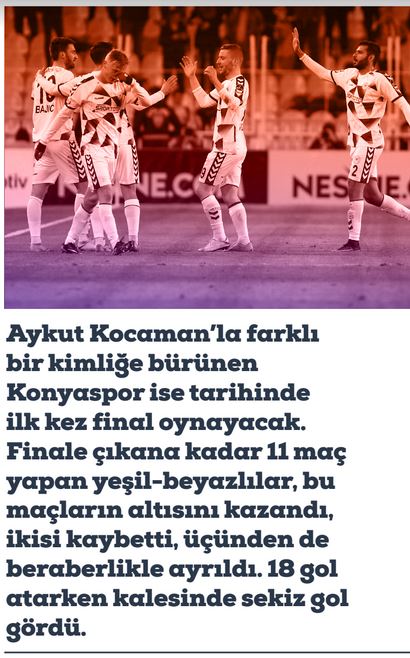 Aykut Kocaman’la farklı bir kimliğe bürünen Konyaspor ise tarihinde ilk kez final oynayacak. Kupaya grup aşamasından katılan Konyaspor, H Grubu’nda Süper Lig’den Trabzonspor, Spor Toto 2. Lig’den Gümüşhanespor ve 3. Lig’den Kızılcabölük’le eşleşti. Grupta ilk iki sırayı alan takımların son 16 turuna kalacağını dikkate aldığımızda Konyaspor için şanslı bir gruptu. Nitekim Aykut Kocaman’ın öğrencileri altı maçlık grup aşamasını üç galibiyet, iki beraberlik ve bir yenilgiyle 11 puan toplayıp liderliği aldı. Grubun sürprizi Trabzonspor’un, averajla Gümüşhanespor’un arkasında kalarak kupaya erken havlu atması olmuştu.