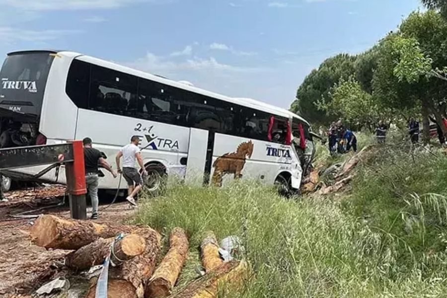 Ezine’den Çanakkale yönüne giden Oktay Batır’ın kontrolünü yitirdiği 33 ANK 274 plakalı tomruk yüklü kamyon, refüjü geçerek karşı şeride devrildi. Kamyonun kasasındaki tomrukların yola savruldu. Bu sırada Ezine yönüne giden 34 DCJ 400 plakalı otomobil ile İstanbul-İzmir seferini yapan içerisinde 22 yolcu ve 3 personel bulunan Truva Turizm’e ait 17 AHT 624 plakalı yolcu otobüsü, tomruklara çarpıp, savrularak şarampole girdi.