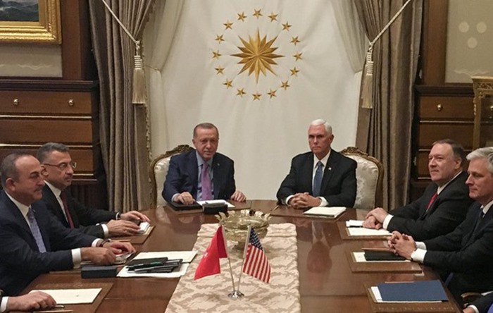 ABD Başkan Yardımcısı Mike Pence ile AKP’li Cumhurbaşkanı Recep Tayyip Erdoğan’ın 1 saat 40 dakikalık görüşmesinin ardından Dışişleri Bakanı Mevlüt Çavuşoğlu ile 4 saat 20 dakikalık görüşme sonucu açıklama yaptı. Pence’nin açıklamasının satır başları şöyle;