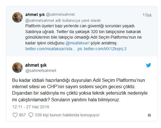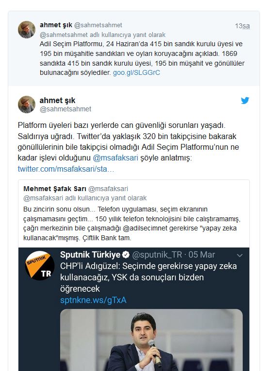 Adil Seçim Platformu üyelerinin can güvenliği sorunları yaşadığını ve saldırıya uğradığını belirten Şık, “Twitter’da yaklaşık 320 bin takipçisine bakarak gönüllülerinin bile takipçisi olmadığı Adil Seçim Platformu’nun ne kadar işlevi olduğunu @msafaksari şöyle anlatmış” dedi ve Mehmet Şafak Sarı’nın paylaşımlarını aktardı: