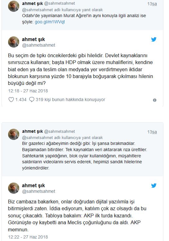 “Bu seçim de tıpkı öncekilerdeki gibi hilelidir. Devlet kaynaklarını sınırsızca kullanan; başta HDP olmak üzere muhaliflerini, kendine biat eden ya da teslim olan medyada yer verdirtmeyen iktidar blokunun karşısına yüzde 10 barajıyla boğuşarak çıkılması hilenin büyüğü değil mi?” diyen Şık’ın paylaşımları şöyle: