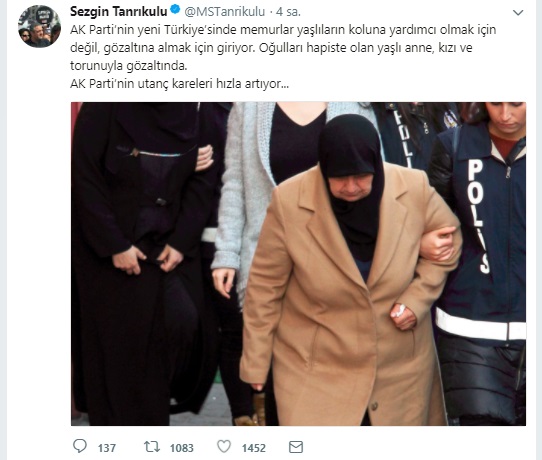 CHP İstanbul Milletvekili Sezgin Tanrıkulu, Twitter’dan paylaştığı fotoğrafa “AK Parti’nin yeni Türkiye’sinde memurlar yaşlıların koluna yardımcı olmak için değil, gözaltına almak için giriyor” yorumunda bulundu. Tanrıkulu’nun paylaştığı fotoğraftaki yaşlı kadın geçtiğimiz hafta içi soy ismi Boydak olduğu için gözaltına alınan kişiler arasında yer alıyordu. Suçlama ise Bankasya’ya para yatırma olarak gösterilmişti.
