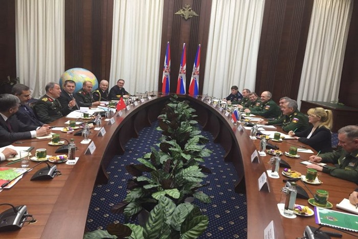 Rusya Savunma Bakanı Sergey Şoygu, Moskova’ya giden Genelkurmay Başkanı Hulusi Akar ve MİT Müsteşarı Hakan Fidan’la bir araya geldi. Ziyaretin Türkiye, Afrin’e olası bir operasyon için hazırlıklarını sürdürürdüğü döneme gelmesi dikkat çekti. Toplantıdan Genelkurmay Başkanlığı tek bir fotoğraf paylaşırken Rusya tarafının paylaştığı fotoğraflar dikkat çekti. Paylaşılan fotoğraflarda Akar ve Fidan sıkıntılı olduğu görülürken Rus tarafının rahatlığı paylaşımlara yansıdı.