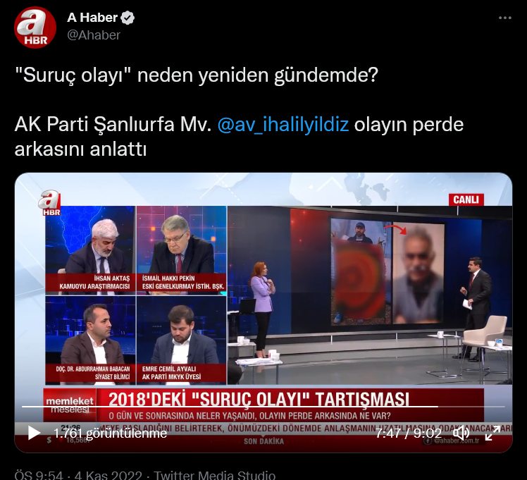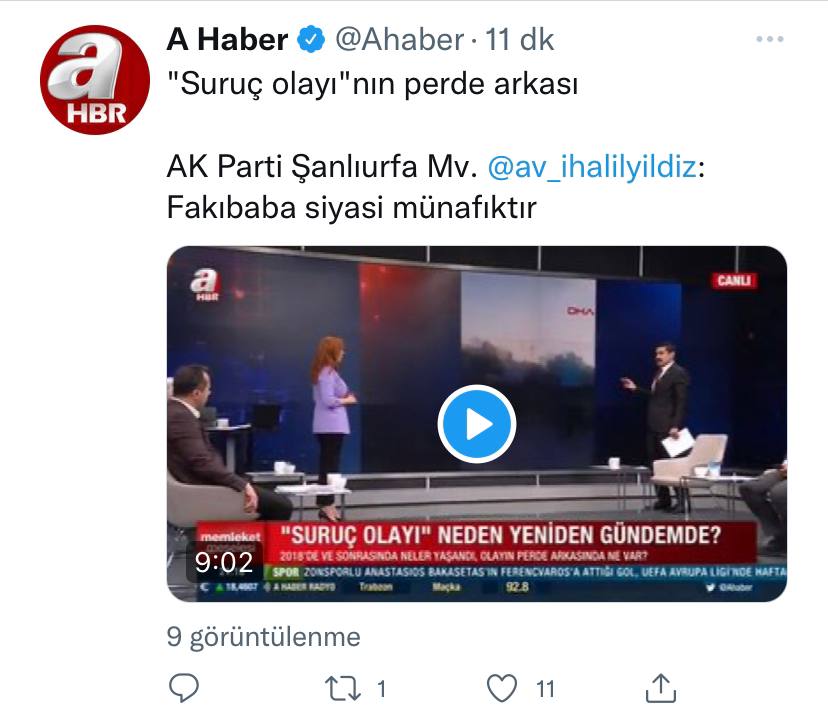 AKP rejiminin propaganda organı A Haber’de konuk olan AKP Şanlıurfa Milletvekili İbrahim Halil Yıldız, AKP’den istifa ederek İYİ Parti’ye katılan eski Gıda, Tarım ve Hayvancılık Bakanı Ahmet Eşref Fakıbaba ‘münafık’, Şenyaşar ailesini de ‘terörist’ ilan etti. dedi. Yıldız’ın sözlerini paylaşan A Haber, kısa bir süre sonra paylaşımı sildi.
