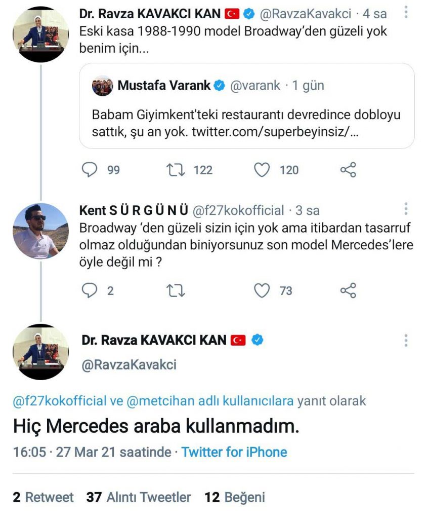 Bu tweeti alıntılayarak ”Eski kasa 1988-1990 model Broadway’den güzeli yok benim için…” yazan Kavakcı Kan’a takipçilerinden biri ”Öyle olduğu için mi Mercedes’e biniyorsunuz?” diye sordu. Bunun üzerine Ravza Kavakcı Kan, hiç Mercedes araba kullanmadığını söyledi.