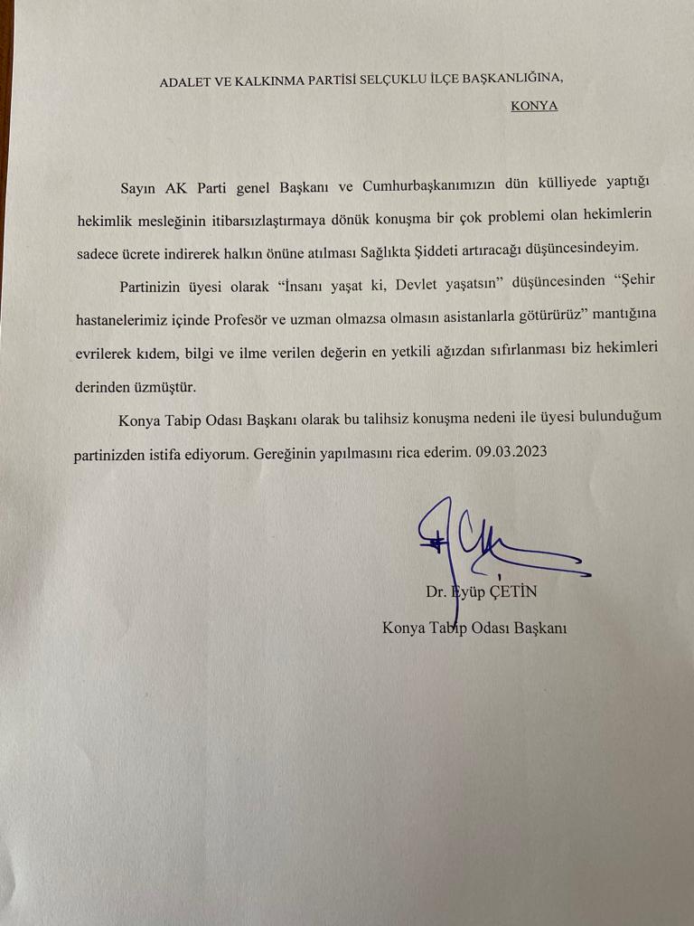 - Konya Tabip Odası Başkanı olarak bu talihsiz konuşma nedeni ile üyesi bulunduğum partinizden istifa ediyorum. Gereğinin yapılmasını rica ederim.