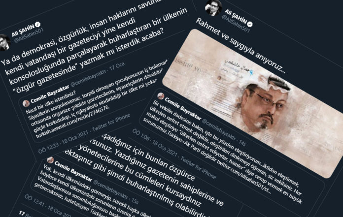 Tartışmanın sonunda, “Bu ülkede yaşadığınız için bunları özgürce yazabiliyorsunuz. Yazdığınız gazetenin sahiplerine ve ülkenin yönetecilerine bu cümleleri kursaydınız meslektaşınız gibi şimdi buharlaştırılmış olabilirdiniz.” diyen AKP’li Şahin, ardından Suudi Başkonsolosluğu’nda öldürülen gazeteci Cemal Kaşıkçı’nın fotoğrafını Cemile Bayraktar’ı da etiketleyip paylaşarak, “Rahmetle anıyoruz.” ifadelerini kullandı.