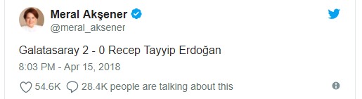 İYİ Parti lideri Meral Akşener, Galatasaray’ın Medipol Başakşehir’i yendiği maçın ardından “Galatasaray 2 – 0 Recep Tayyip Erdoğan” diye yazdı.