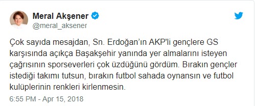 Akşener, Galatasaray’ın kendi evinde Medipol Başakşehir’i 2-0 yendiği maçın 0-0 biten ilk yarısının ardından Twitter hesabından “Çok sayıda mesajdan, Sn. Erdoğan’ın AKP’li gençlere GS karşısında açıkça Başakşehir yanında yer almalarını isteyen çağrısının sporseverleri çok üzdüğünü gördüm. Bırakın gençler istediği takımı tutsun, bırakın futbol sahada oynansın ve futbol kulüplerinin renkleri kirlenmesin” mesajını paylaştı.