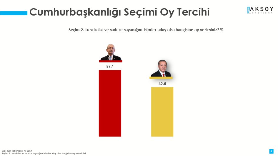 Aksoy Araştırma, son seçim anketinin sonuçlarını sosyal medya hesabından paylaştı. Buna göre seçimin ikinci tura kalması halinde, Millet İttifakı cumhurbaşkanı adayı Kemal Kılıçdaroğlu, AKP’li Cumhurbaşkanı Erdoğan’a fark atıyor. Açıklanan verilere göre Kılıçdaroğlu yüzde yüzde 57’nin üzerinde oy alırken, Erdoğan yüzde 42’lerde kalıyor. İki isim arasındaki fark 14 puanın da üzerinde.