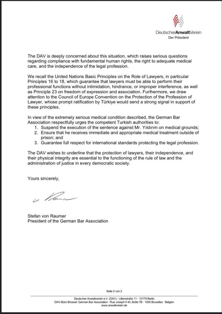 DAV Başkanı Stefan von Raumer imzalı 8 Ekim 2025 tarihli mektupta, 60 binden fazla avukatı temsil eden Alman Avukatlar Birliği’nin, Yıldırım’ın cezaevinde ciddi sağlık sorunları yaşadığını ve yaşamının tehlikede olduğunu belirttiği aktarıldı.