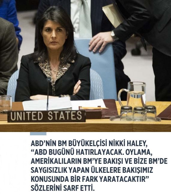 Nitekim ABD’nin BM Büyükelçisi Nikki Haley de yaptığı açıklamada, “ABD bugünü hatırlayacak. Oylama, Amerikalıların BM’ye bakışı ve bize BM’de saygısızlık yapan ülkelere bakışımız konusunda bir fark yaratacaktır” sözlerini sarf etti. Muhtemelen Trump, BM kararını dinlemeyerek Kudüs’te ABD elçiliği açmaya çalışacaktır. Bu da BM’nin uluslararası arenadaki etkinliğinin bizzat BM’nin en büyük bağışçısı tarafından iğdiş edilmesi anlamına gelecektir.