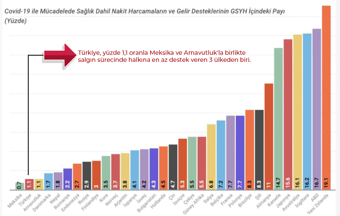 Türkiye, yüzde 1,1 oranla Meksika ve Arnavutluk’la birlikte halkına en az destek veren 3 ülkeden biri. Nepal’in bile halkına verdiği desteğin GSYH’sına oranı yüzde 1,8! Türkiye’nin dünyada yapılan toplam nakit harcama ve destekler içindeki payı binde bir. Toplam ekonomik destekler içinde vatandaşa dönük harcama ve desteklerin en düşük olduğu ülke Türkiye.