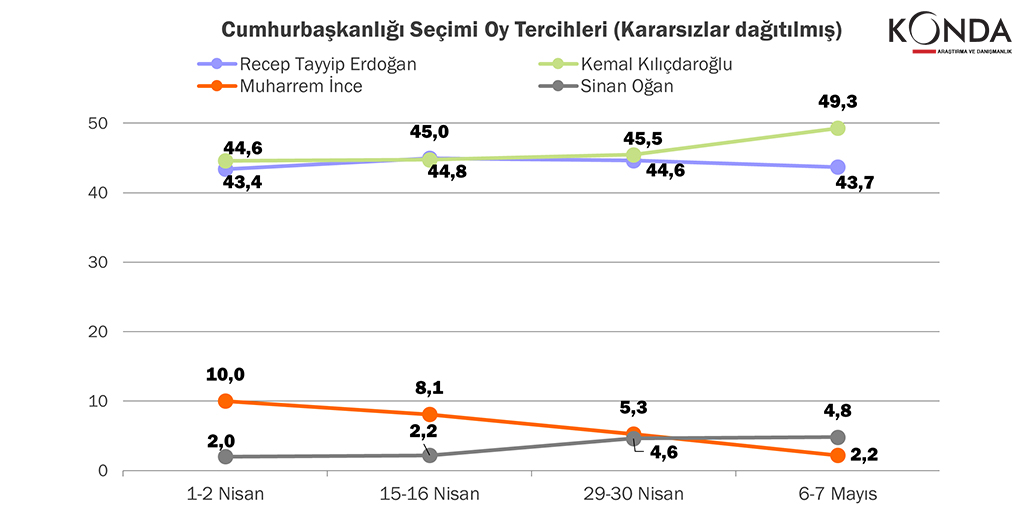 KONDA’nın sabah açıklanan anketinde de Kemal Kılıçdaroğlu’nun oy oranının Tayyip Erdoğan’dan fazla olduğu belirtilmişti. Buna göre ilk turda Kemal Kılıçdaroğlu yüzde 49,3; Tayyip Erdoğan 43,7; Sinan Oğan yüzde 4,8 ve Muharrem İnce yüzde 2,2 oy alıyordu.