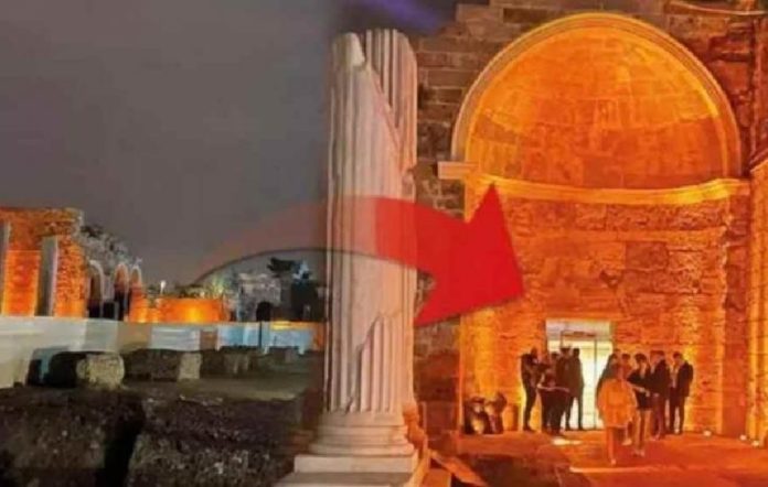 Antalya’nın Manavgat ilçesindeki Side Antik Kenti’nde tarihi M.S. 150 yıllarına dayanan ‘Athena’ tapınağının kazı alanına açılan kapı ve çevresi, özel mülkiyet içinde ‘Apollon’ ismiyle faaliyete geçirilen gece kulübünün giriş kapısı olarak yeniden düzenlendi.