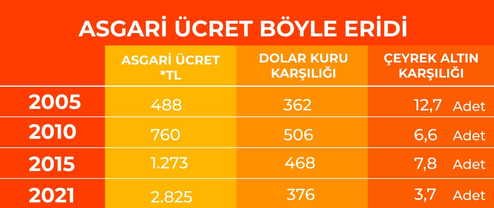 Asgari ücret AKP iktidarı boyunca her yıl daha da eridi. AKP, 2002 yılında iktidara geldi. 2005 yılında 488 TL’lik asgari ücretle tanesi 38,5 liradan 12,7 çeyrek altın alınabiliyordu. 2015 yılında asgari ücretle alınabilecek çeyrek altın miktarı 7,8 adete geriledi. Bugün zamlı asgari ücretle ile ancak 3,7 çeyrek altın alınabiliyor. Yine 2010 yılında asgari ücret 506 dolara denk geliyordu. 2015’de rakam 468 dolara geriledi. Bugün asgari ücretlinin maaşı ancak 376 dolar ediyor!