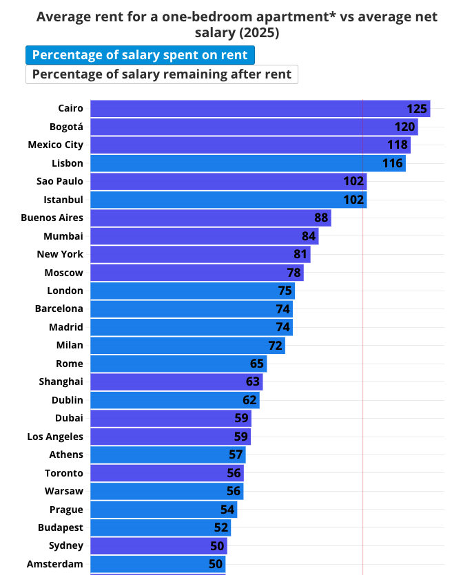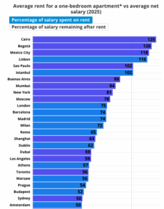 Dikkat çeken bir başka veri ise kiraların, şehirdeki ortalama maaşlara oranı. İstanbul, Lizbon ile birlikte ortalama maaşın, şehir merkezindeki bir odalı dairenin kirasını karşılamadığı tek şehir. Ortalama net maaşın 855 avro civarında olduğu İstanbul’da, tek odalı dairelerin kirası 868 avro. Bu da maaşın yüzde 102’sine denk geliyor. Yani kiracılar maaşlarından daha fazla para harcamak zorunda kalıyor.
