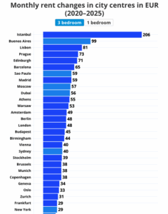 2020 yılında şehir merkezindeki 3 odalı bir daire için ortalama kira 527 avro seviyesindeydi. 5 yıl içinde bu rakam yüzde 206 oranında artarak 2025’te 1.614 avroya yükseldi. Bu artış, İstanbul’u sadece Doğu Avrupa değil, Batı Avrupa şehirlerini de geride bırakarak listenin en üstüne taşıdı.