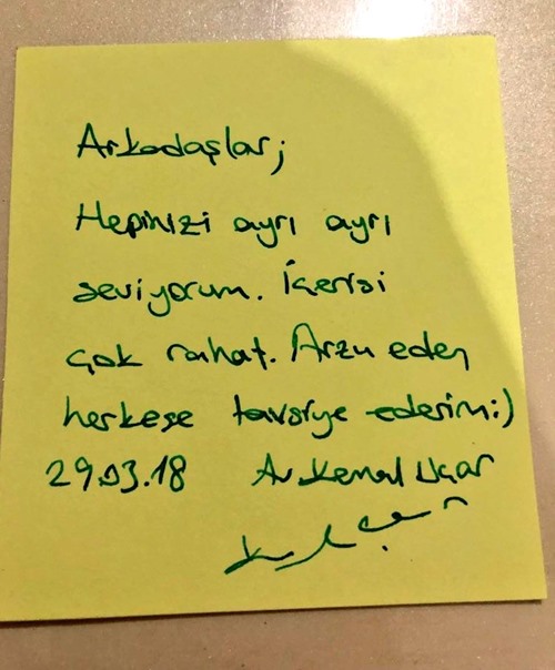 Gazeteci Ece Sevim Öztürk’ün paylaştığı yazılı mesajda Uçar, “Arkadaşlar; hepinizi ayrı ayrı seviyorum. İçerisi çok rahat. Arzu eden herkese tavsiye ederim:) 29.03.2018-Avukat Kemal Uçar” ifadelerini kullandı.