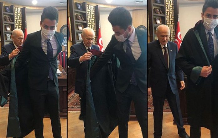 Avukat Çağrı Can Pak, sosyal medyadan paylaştığı fotoğraflarda avukatlık cübbesini MHP Genel Başkanı Devlet Bahçeli’nin ellerinden giydi.