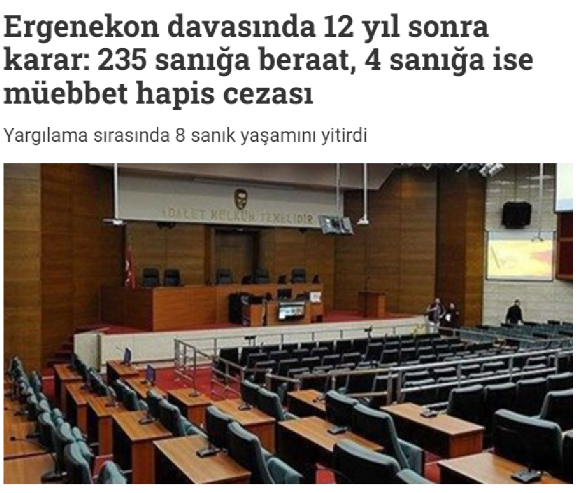 Bu dava, üzerinden 12 yıl geçtikten sonra, cemaat terörist ilan edildikten sonra da devam etti. Erdoğan bu örgütü ulusalcıların yumuşak karnı olarak kullanmayı sürdürdü. Umarım ve beklerim ki Canikligil-Seven ikilisi bu soruyu yine bu atarla Erdoğan’a da sorabilsinler. Zira şuradaki haberde okuyacağınız gibi, bu davanın toplam tutuklu sayısı olan 235 sanık beraat ettirildi ve 4 sanığa müebbet verildi.