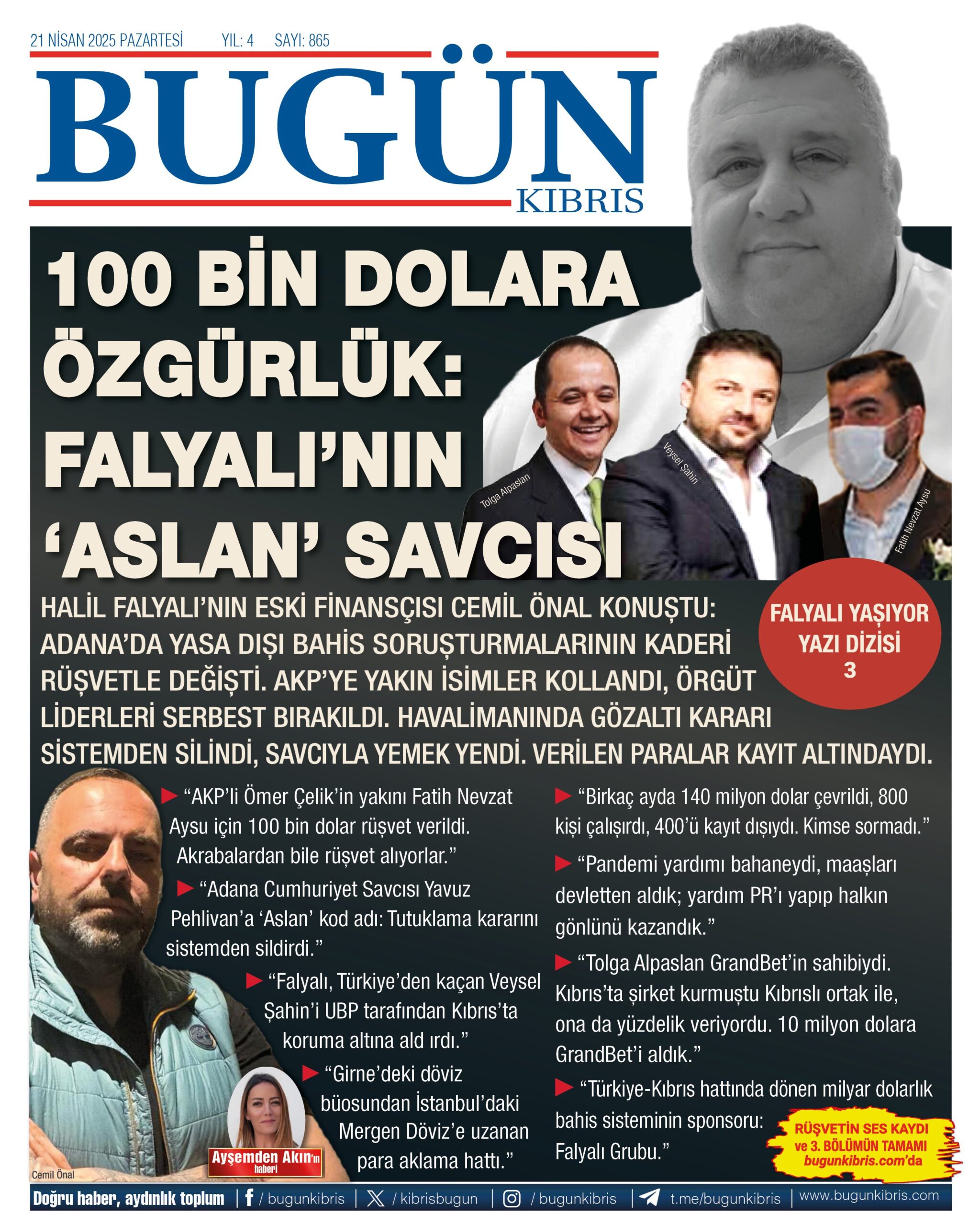 Sanal bahis ve kumar baronu Halil Falyalı’nın eski Finans Müdürü Cemil Önal’ın Kıbrıs’ta AKP’li üst düzey siyasi ve bürokratlara kadar ulaşan kara para tezgahını deşifre ettiği için koruma altında olduğu Hollanda’da öldürülmesi kamuoyunda büyük yankı uyandırdı. Cemil Önal’la yaptığı röportajı 14, 17 ve 21 Nisan tarihlerinde yayınlayan Bugün Kıbrıs Gazetesi’nin sahibi ve Genel Yayın Yönetmeni Ayşemden Akın da tıpkı Cemil Önal gibi tehdit alıyordu.