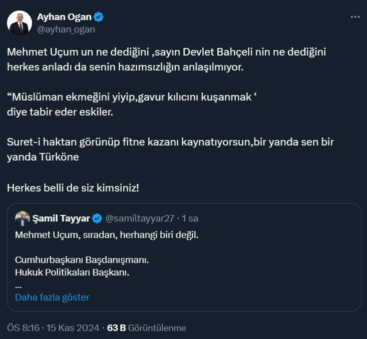 Cumhurbaşkanı danışmanlarından Ayhan Ogan, Bahçeli’nin dediğini herkesin anladığını, buna karşılık Tayyar’ın hazımsızlığının anlaşılmadığını belirtti ve “Müslüman ekmeğini yiyip gavurun kılıcını kuşandığını” öne sürdü. Ogan’ın Uçum’a destek vermesi üzerine Şamil Tayyar, Saraydaki Soros temsilcisi sayısında artışa gitti: