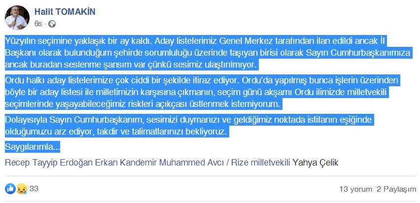 Binicioğlu’nun istifa etmesinin ardından sosyal medyadan Erdoğan’a seslenen AKP Ordu İl Başkanı Halit Tomakin şu ifadeleri kullandı: