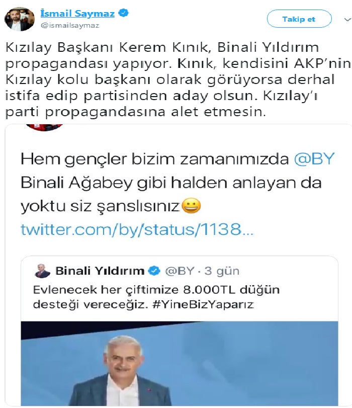 Kızılay Başkanı Kerem Kınık’ın AKP’nin İBB adayı Binali Yıldırım’a destek vermesi sosyal medyada gündem oldu. Twitter kullanıcıları Kınık’a sert tepki gösterdi.