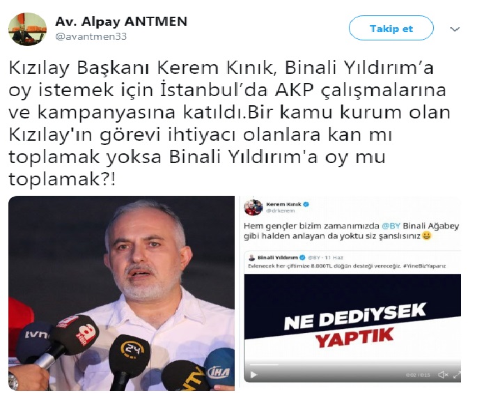 Türk Kızılayı Genel Başkanı Kerem Kınık’ın İstanbul seçimlerine ilişkin olarak AKP’nin adayı Binali Yıldırım’a destek mesajı paylaşması tepki çekti.