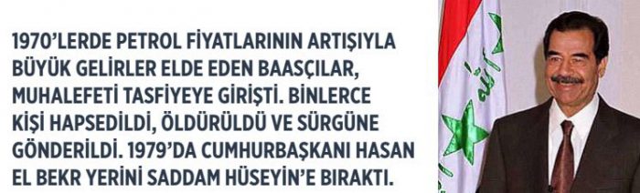 1970’lerde petrol fiyatlarının artışıyla büyük gelirler elde eden Baasçılar, muhalefeti tasfiyeye girişti. Binlerce kişi hapsedildi, öldürüldü ve sürgüne gönderildi. 1979’da Cumhurbaşkanı Hasan el Bekr yerini Saddam Hüseyin’e bıraktı. Saddam, ülkede bir “kült” haline gelerek tek adam rejimi kurdu.