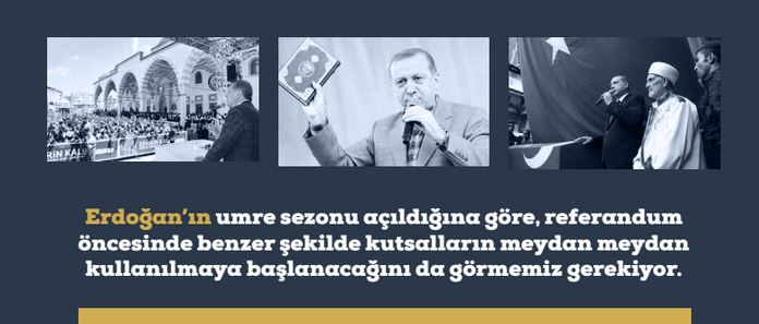 Umre, Erdoğan tarafından seçim malzemesi olarak ilk defa kullanılmadı. Örneğin 2015’te biri Mart diğeri Aralık ayında olmak üzere iki kez umre yaptı Erdoğan. 7 Haziran seçimleri öncesi 1 Mart 2015 Pazar günü Suudi ve Türk koruma ordusunun arasında yapılan umre de kullanıldı. 1 Şubat’ta YSK seçim takvimini açıkladı, 1 Martta umre yapıldı. Ardından milletvekilleri listeleri sunulup seçim startı verildi. 2011, 2014 umrelerini de bunlara dahil etmek gerekiyor. Önceki günkü Umre görüntülerinde Kabe’nin yanıbaşında ‘reis, reis’ nidaları vardı. Mart 2015 umresi ise ‘Kabe’nin kapıları Erdoğan’a açıldı’ diye haberleşti, sosyal medyaya servis edildi.