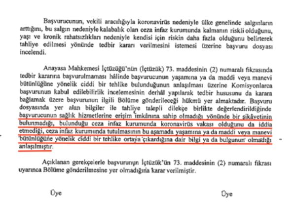 İşbilen’in başvurusunu inceleyen iki AYM üyesi, eski Milletvekili İşbilen’in tutuklu bulunduğu Ankara Sincan Cezaevinde sağlık hizmetlerine erişimin olduğu ve koronavirüs vakasının bulunmadığını belirterek ret kararı vermişler.