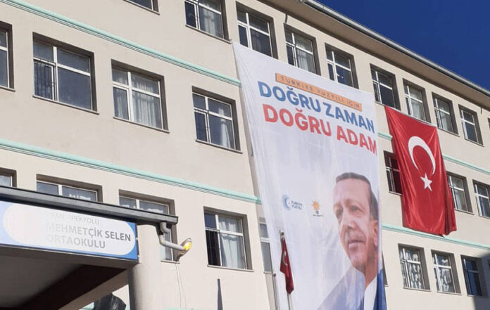 AKP’li Cumhurbaşkanı Erdoğan’ın bugün 14.00’da miting düzenleyeceği Van’da Mehmetçik Selen Ortaokulu’nun duvarına AKP’li Cumhurbaşkanı Recep Tayyip Erdoğan’ın seçim posteri asıldı.